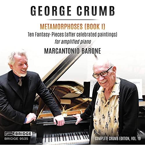Subtitled “Ten Fantasy-pieces (after Celebrated Paintings) for Amplified Piano,” this collection of brief compositions finds the great American composer George Crumb responding musically to modernist paintings by the likes of Paul Klee, Marc Chagall, Jasper Johns, and Salvador Dalí. He does so using a certain amount of extended piano technique as well as electric amplification. By turns contemplative and abrasive, the music explores the piano’s unique resonant properties as well as the opportunities created by the player’s simultaneous proximity to the instrument’s keyboard and its interior; for example, on “Clowns at Night,” the performer must hit a woodblock, stroke a set of chimes, run a wire brush across the strings inside the piano, and play the keys–while also moaning and humming. These pieces were written in the past few years, demonstrating once again that Crumb continues to be an American treasure well into the eighth(!) decade of his musical career.